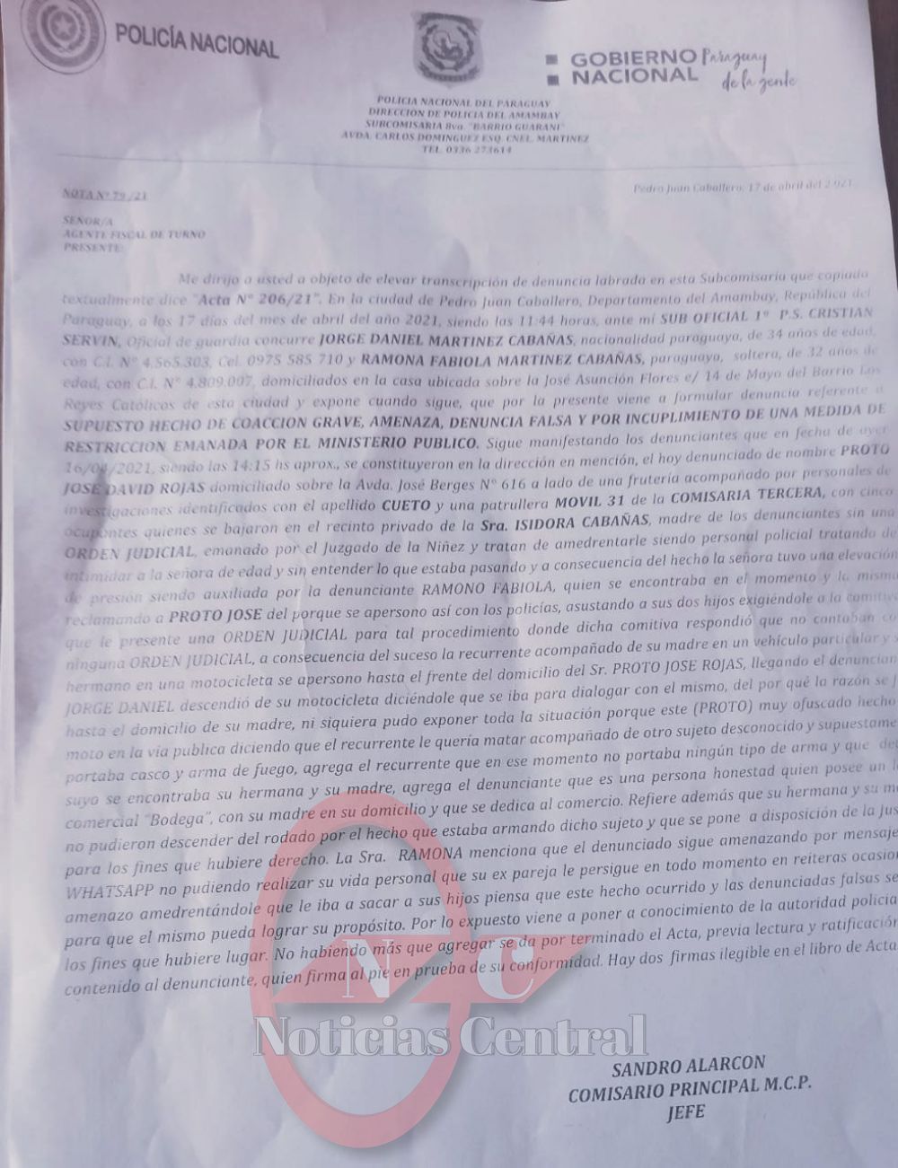 El dirigente político alegó que existen testigos que vieron el momento exacto en cómo era amenazado por su ex cuñado con arma de fuego. Así también el mismo denunció a los Agentes de la Sub Cría 8va del barrio Guaraní por no querer tomarle la denuncia.