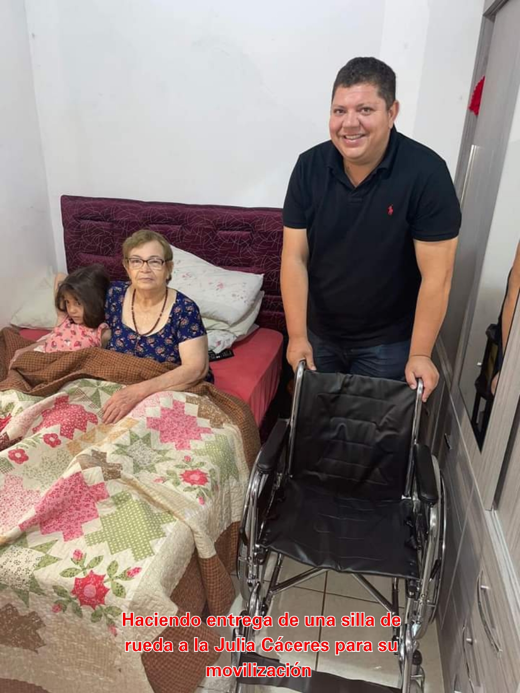 De la misma forma, el Diputado de la gente como se hizo llamar en los primeros tiempos del inicio de sus gestiones, hizo entrega de una silla de ruedas a la señora Julia Cáceres de 81 años quien se encontraba necesitando de dicha herramienta para su movilización