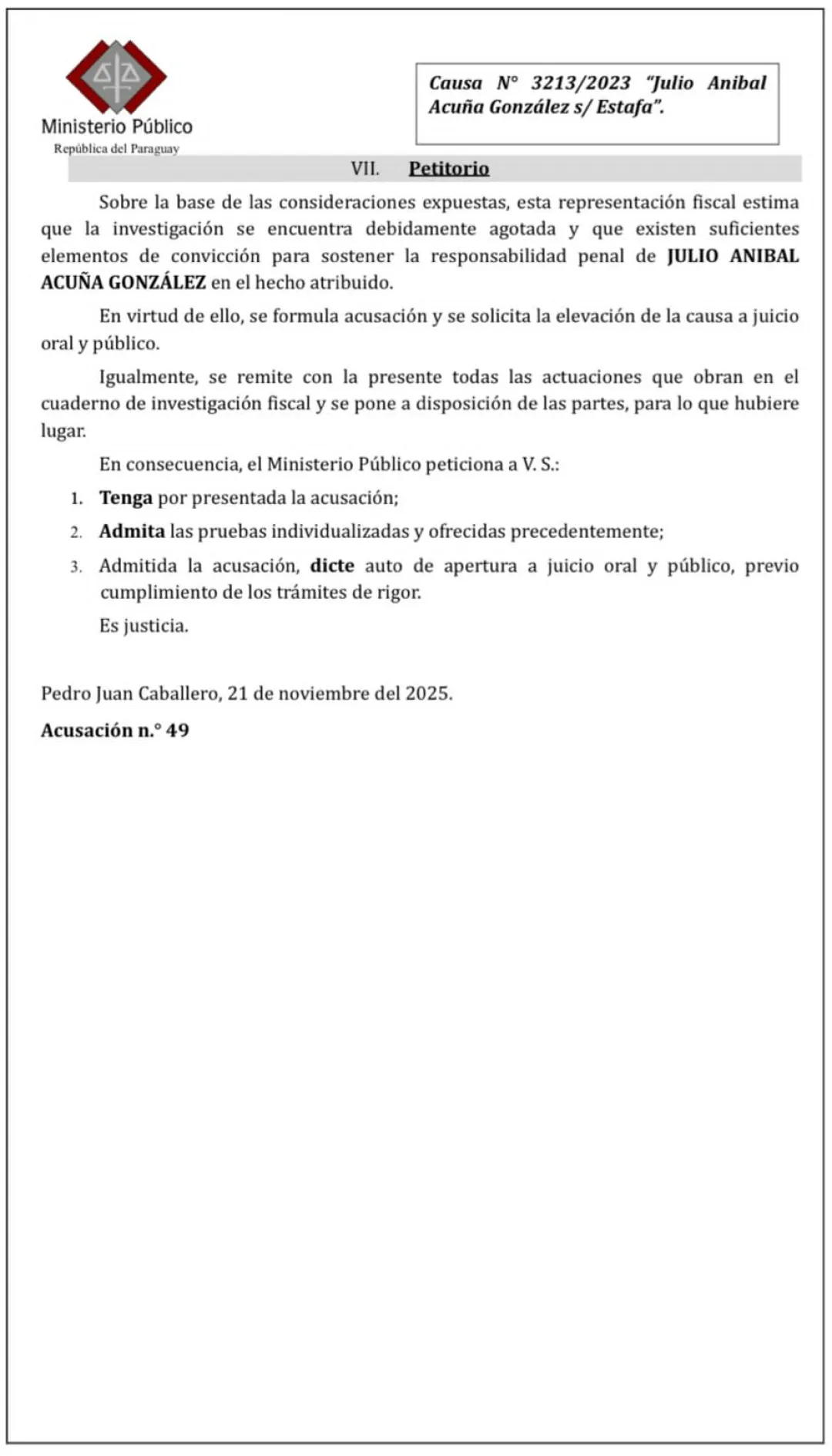 El fiscal Rodrigo J. Espínola pidió reactivar la investigación y llevar a juicio oral a Julio Aníbal Acuña González, acusado de una presunta estafa ocurrida en 2022 mediante un bingo que ofrecía como premio un automóvil Volkswagen Gol 0 km.