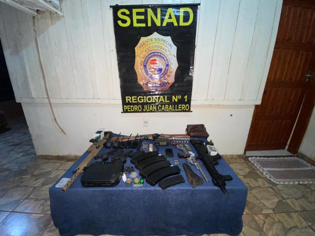 La comitiva sorprendió en el lugar a Mario David Distefano Fleitas, brasileño, de 31 años; Walter Ramón Duarte Espínola, paraguayo, de 32 años y Carlos Enrique Centurión Sosa, paraguayo, de 27 años. Los Agentes Especiales de la SENAD se incautaron en el lugar de 4 camionetas de diferentes marcas, una porción de marihuana y un importante lote de armas y municiones, que se detallan a continuación: